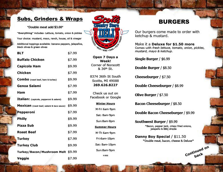 Welcome to Scotts Country Store & Deli, a hidden gem nestled in Scotts, Michigan, that promises a delightful culinary experience. This quaint establishment exudes charm, reminiscent of a classic roadside shop, making it a favorite among locals and visitors alike. The menu here is carefully curated, offering a range of delicious options, from hand-crafted burgers and mouthwatering subs to their standout pizzas, which many customers like Emily Martinez hail as the best in the area.