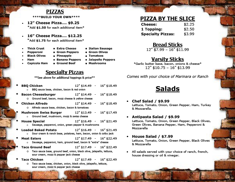 Pepperoni, Italian Sausage, Ham, Capicola Ham, Ground Beef, Bacon, Mushrooms, Green Peppers, Onion, Green & Black Olives, Pineapple, Jalapeno Peppers, Tomatoes, & Banana Peppers